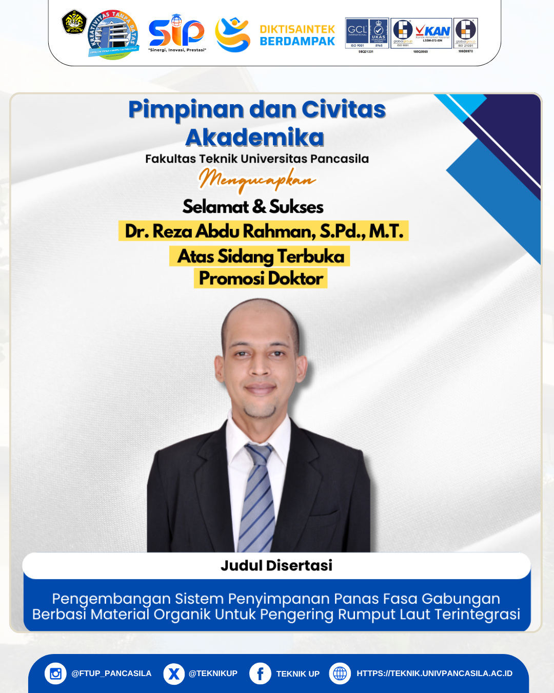 Selamat & Sukses Dr. Reza Abdu Rahman, S.Pd., M.T. Atas Sidang Terbuka Promosi Doktor dengan judul Disertasi “Pengembangan Sistem Penyimpanan Panas Fasa Gabungan Berbasi Material Organik Untuk Pengering Rumput Laut Terintegrasi”Read More